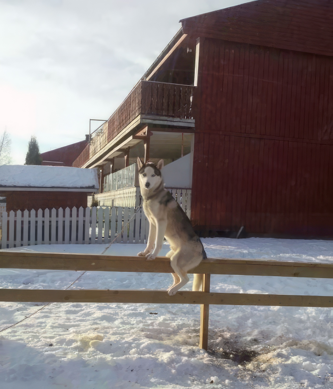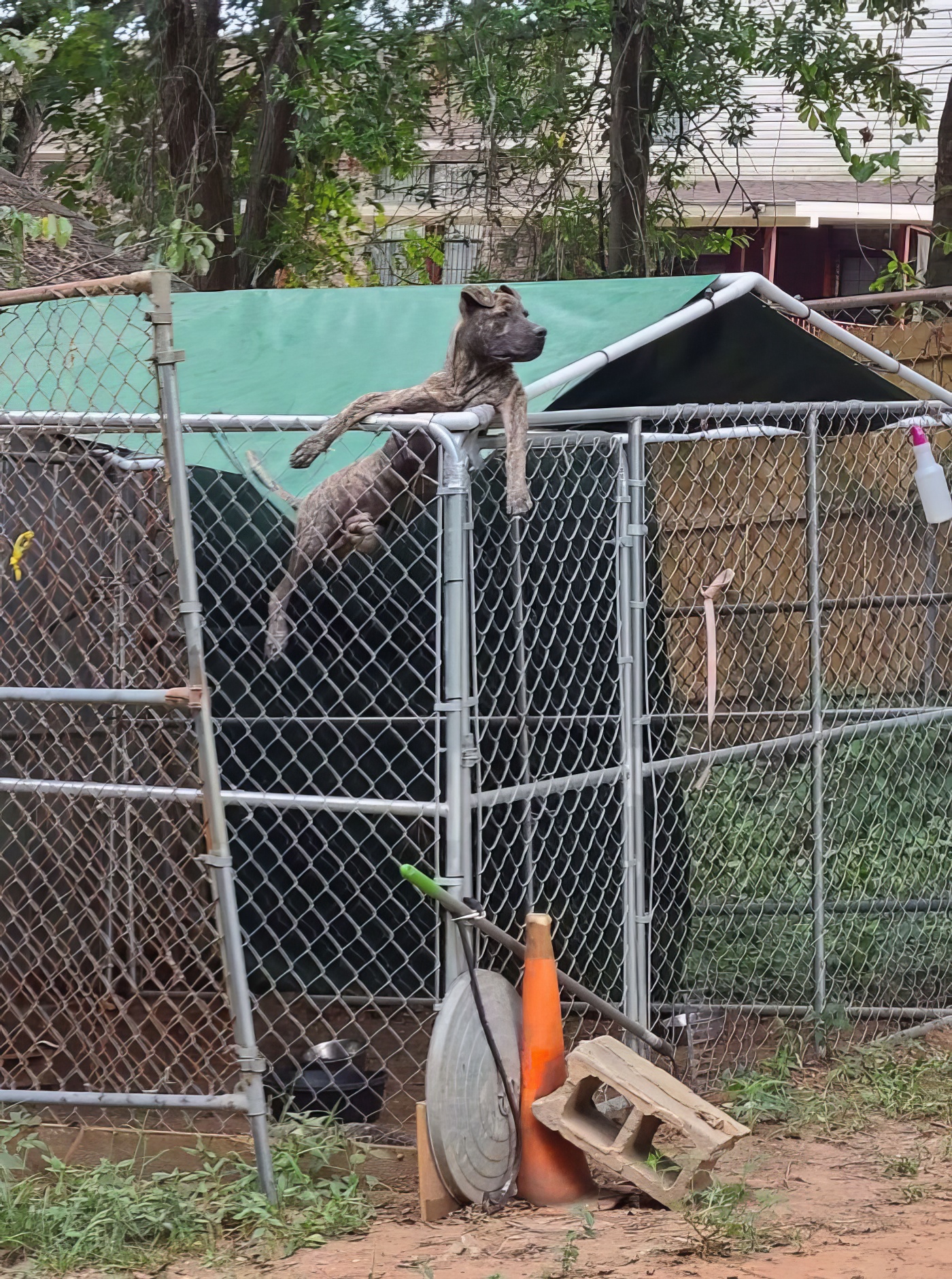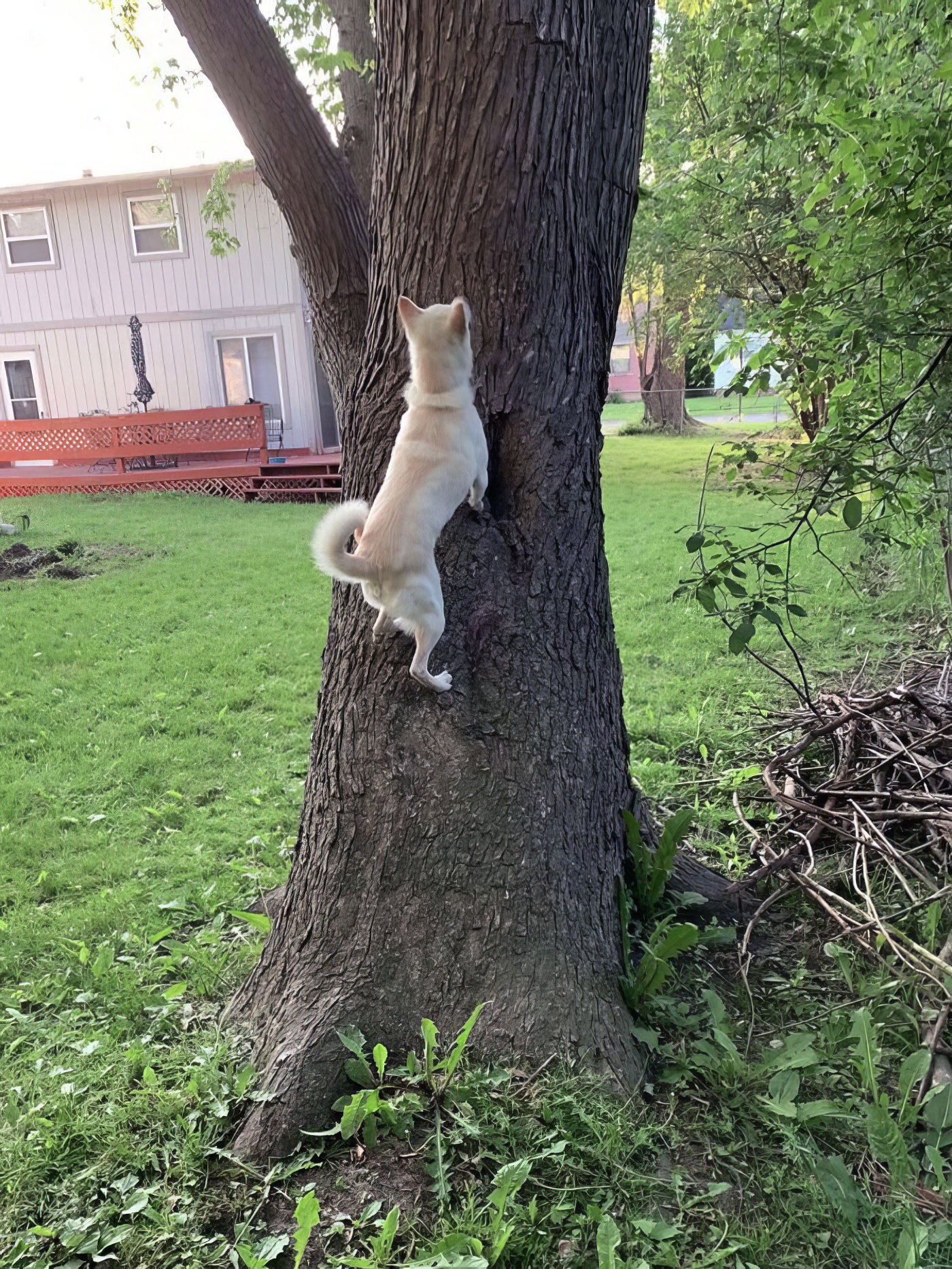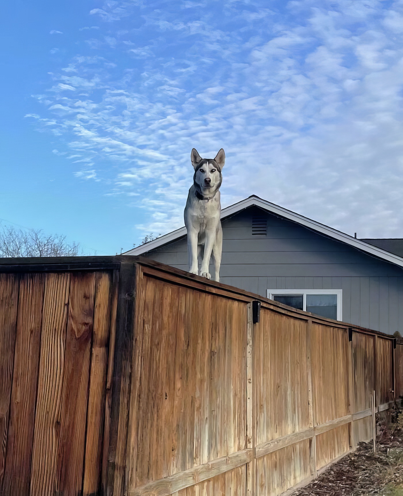 mon chat monte souvent sur la clôture, alors le chien des voisins l’a imité. il est très doué pour faire le chat