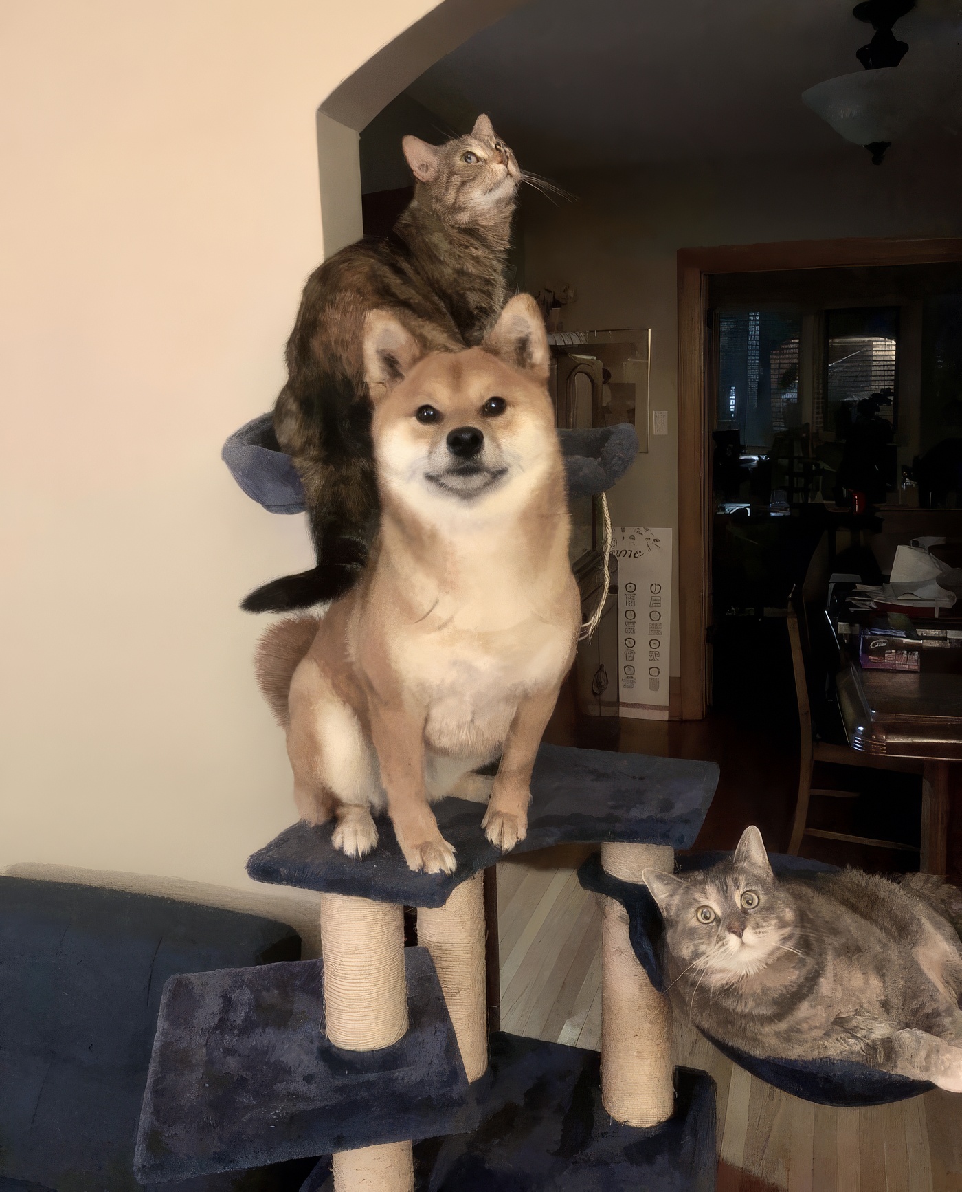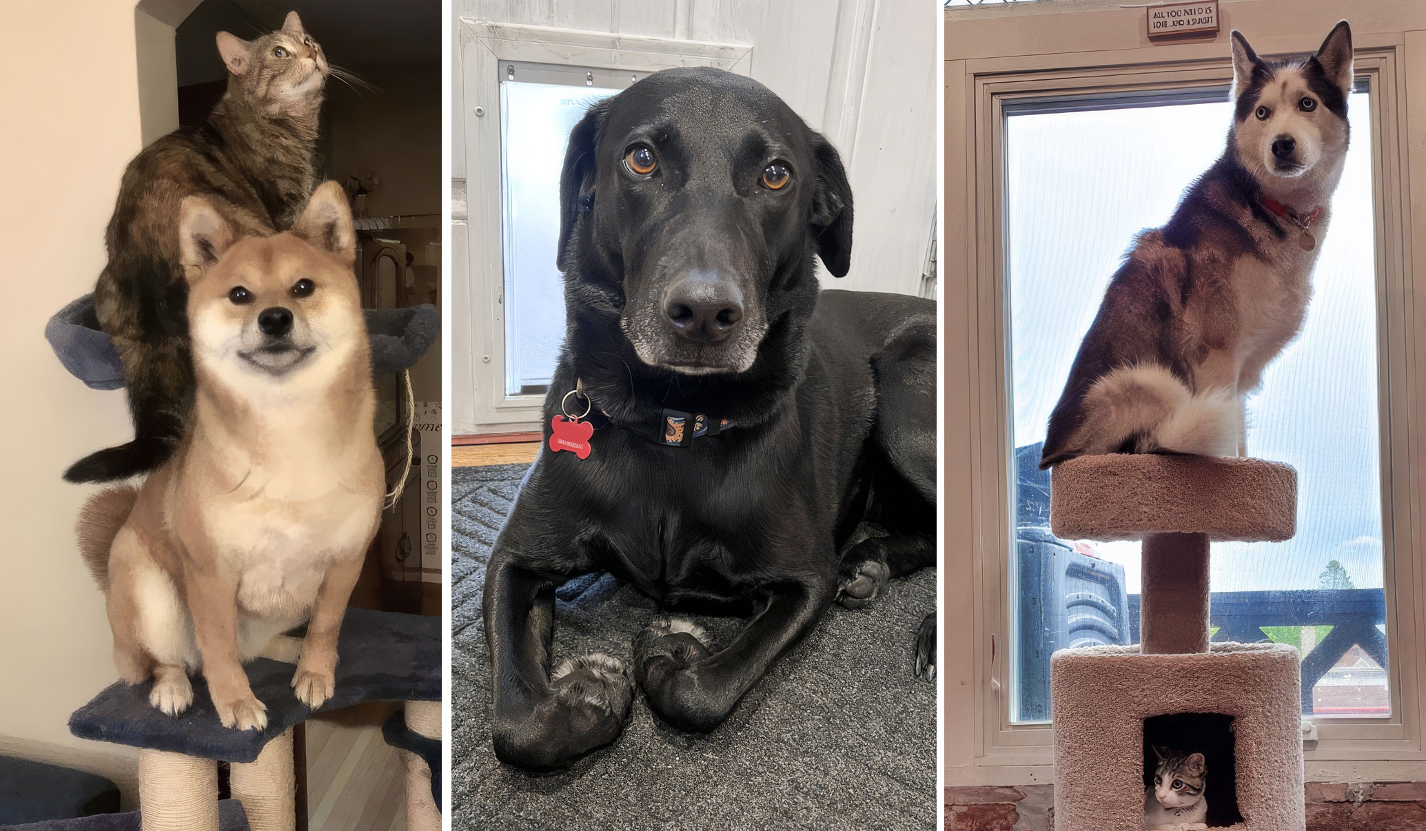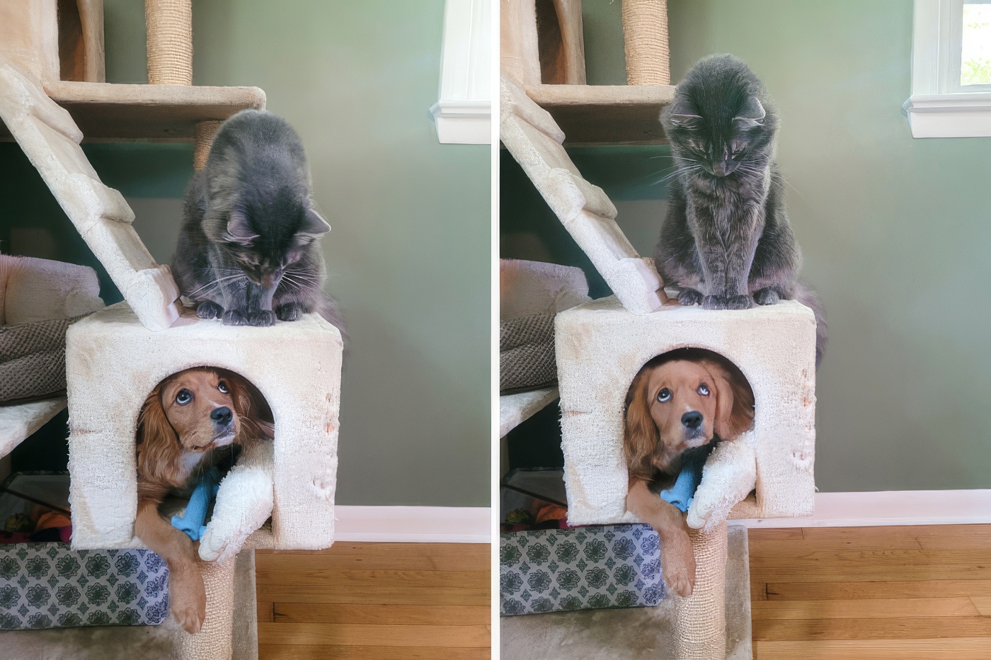 Poppy, le chien-chat, aime être près du chat qui tolère à peine son intrusion dans son Mojo Dojo Casa House