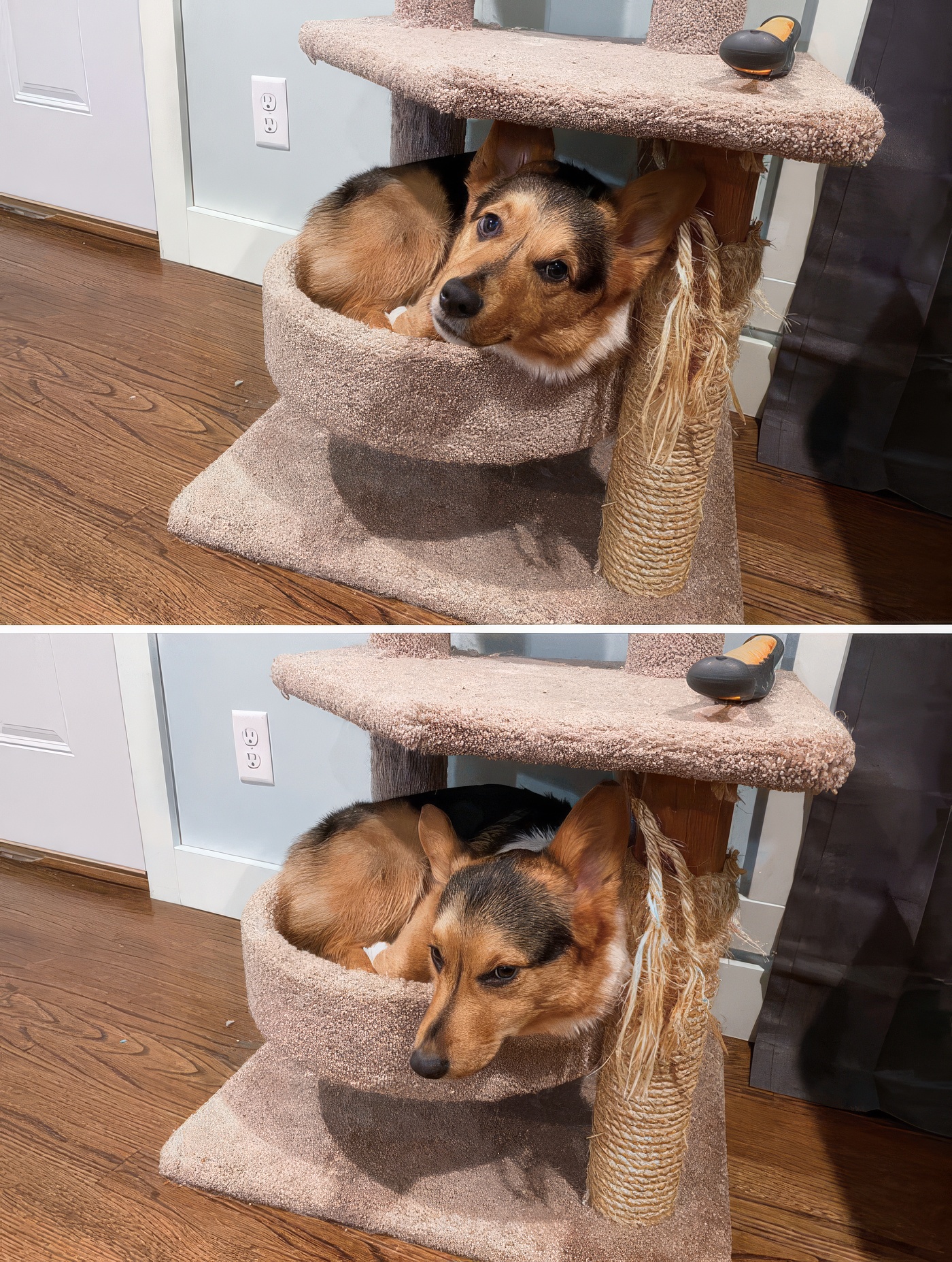 je n’arrête pas d’expliquer à mon corgi que cet arbre est pour les chats, mais il est convaincu qu’il est un vrai chat