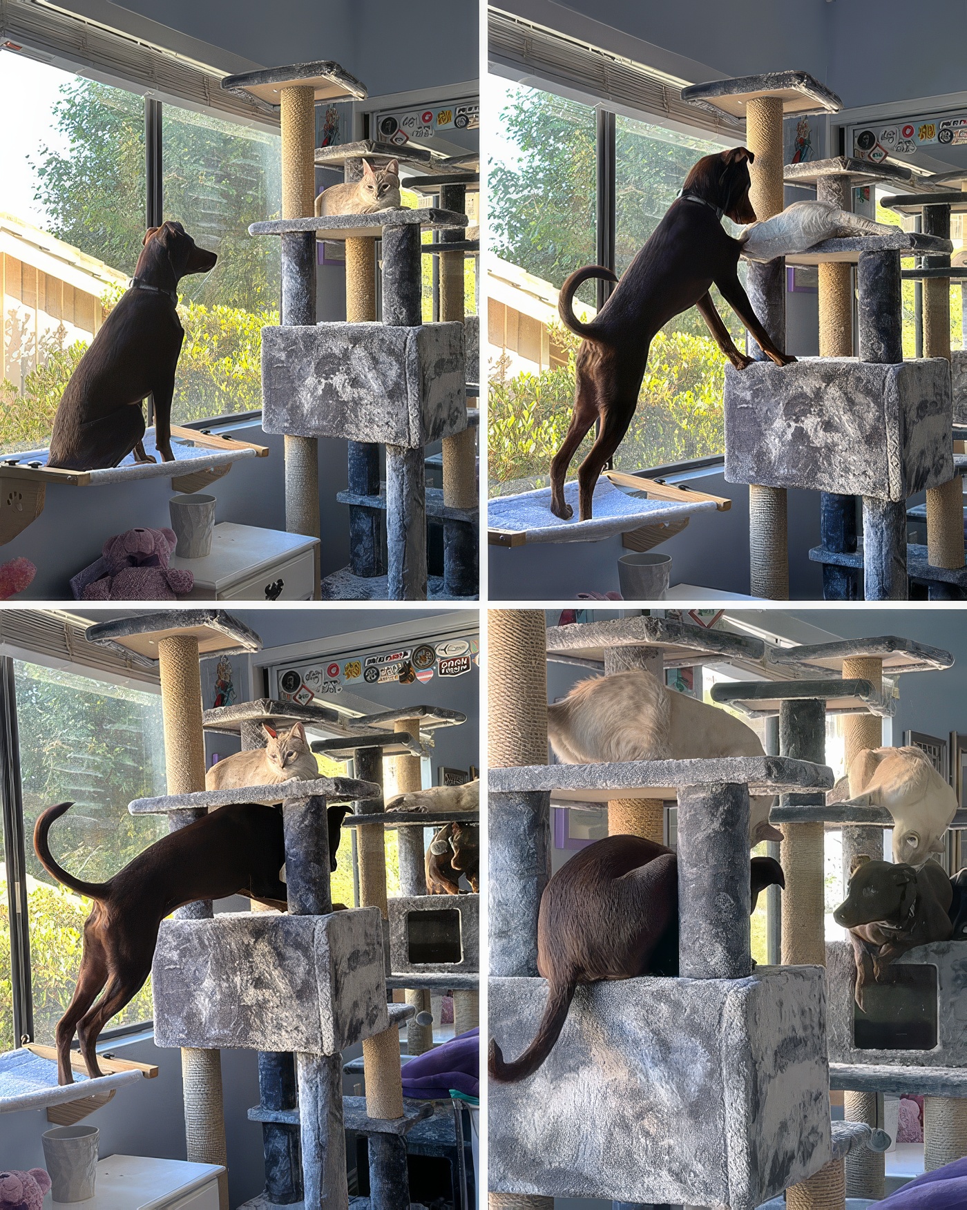 un chien envahit l’arbre à chat