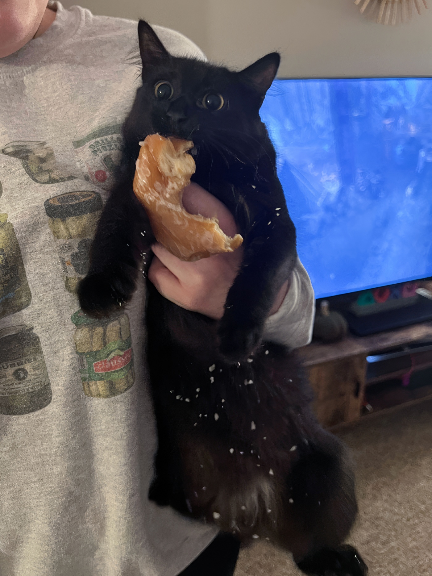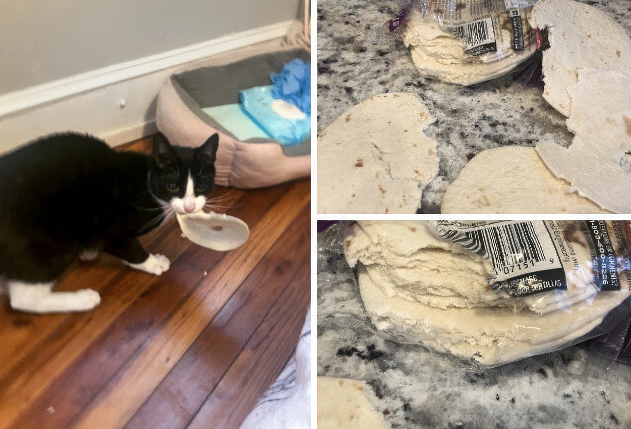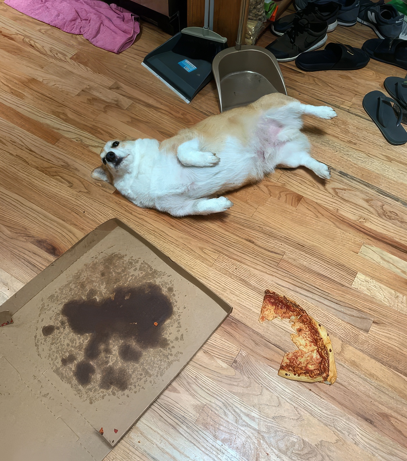 Je suis rentré et j’ai trouvé ce petit monstre repu après avoir mangé ¾ d’une pizza Costco en la faisant tomber du comptoir