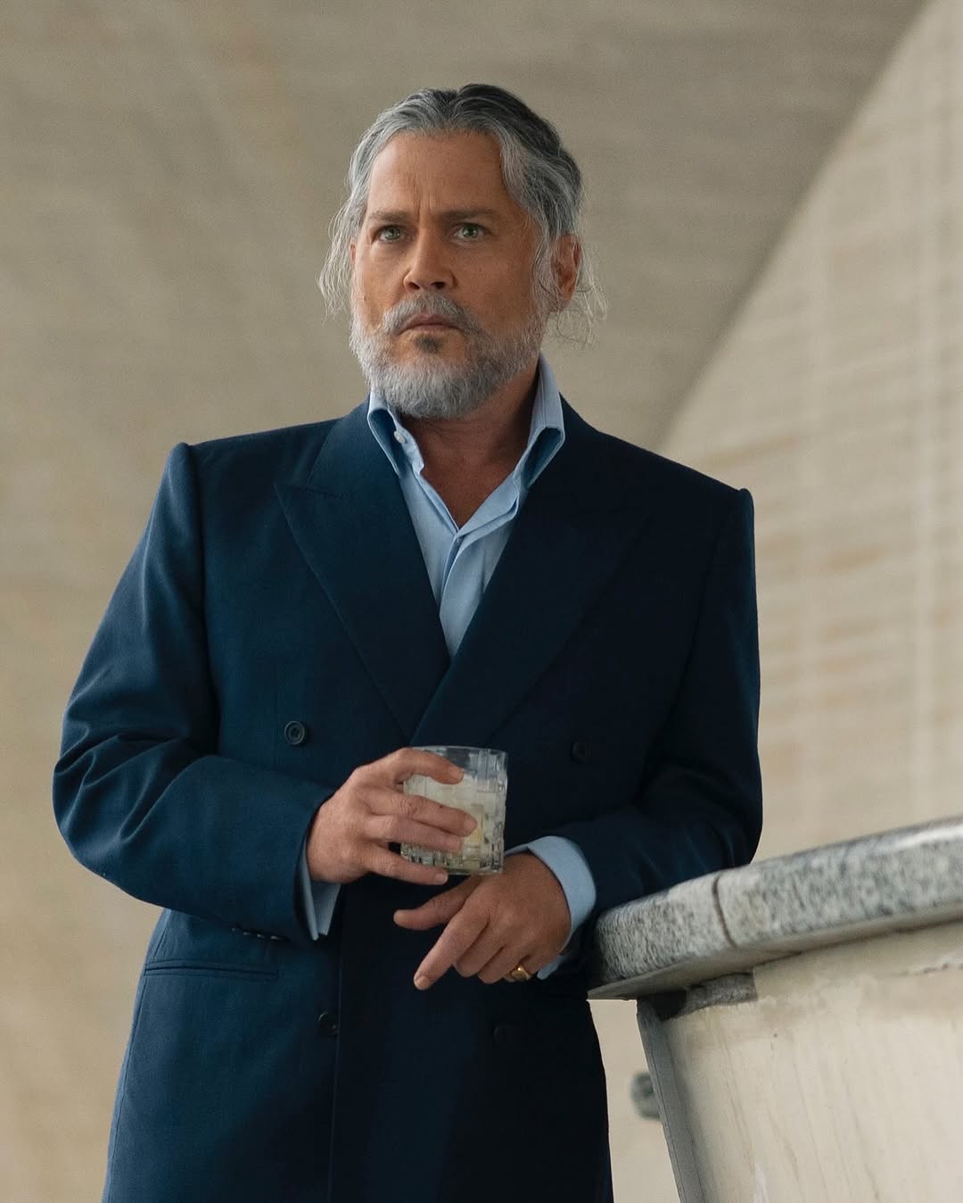 C’est cette photo qui a relancé la machine médiatique. Johnny Depp, vêtu d’un costume bleu marine et d’une chemise ciel, un verre à la main (ironique pour un film intitulé Day Drinker), regarde l’objectif avec intensité. Un anneau doré brille à son auriculaire, mais c’est surtout son look vieilli, assumé, presque méconnaissable, qui a choqué le public. Certains parlent déjà de « comeback monumental ».