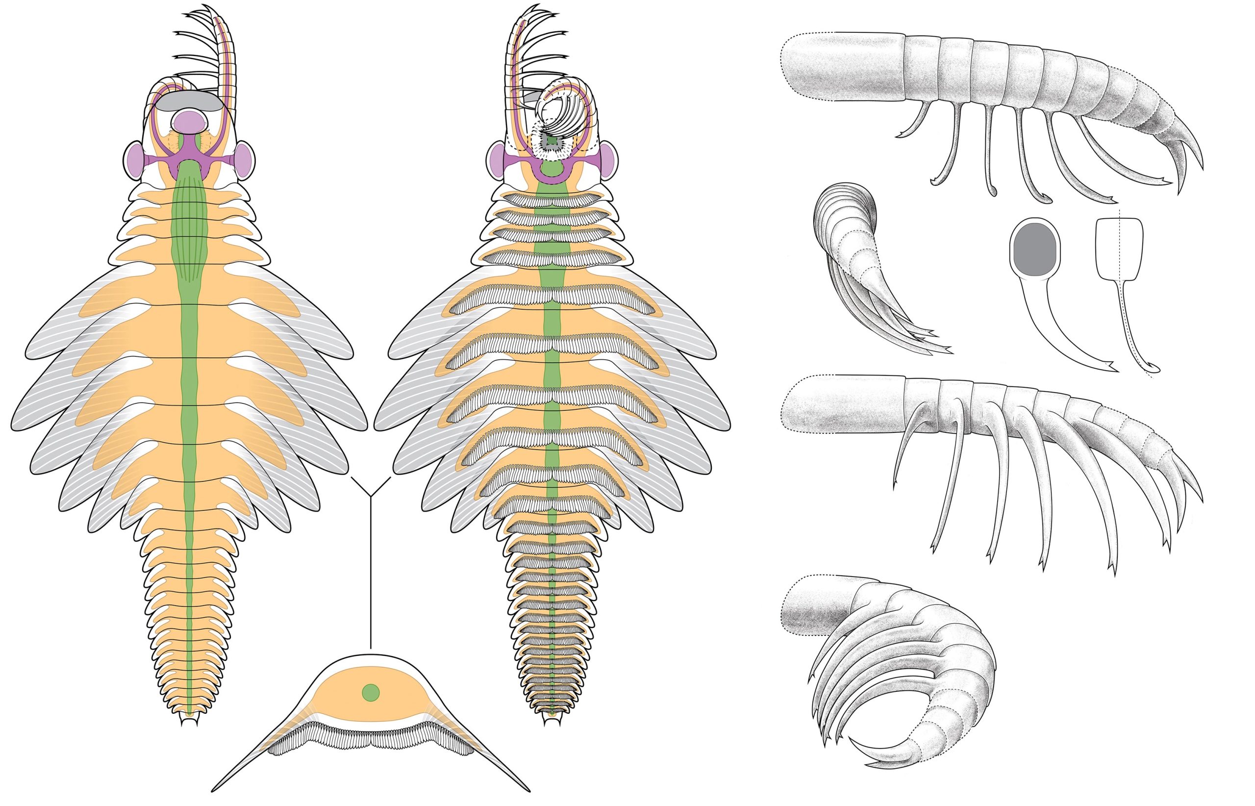 Mosura fentoni fait partie d’une famille ancienne d’animaux marins appelée les radiodonts. Ces créatures, aujourd’hui disparues, étaient des ancêtres des arthropodes, comme les insectes ou les crabes. Le plus célèbre de ce groupe est Anomalocaris, un prédateur marin qui pouvait mesurer jusqu’à un mètre de long. Il avait des bras couverts de piques pour attraper ses proies et une bouche ronde remplie de dents. Mosura, bien que plus petit, partageait des caractéristiques similaires : il utilisait un disque d’alimentation pour se nourrir et des nageoires plates pour nager dans l’eau.