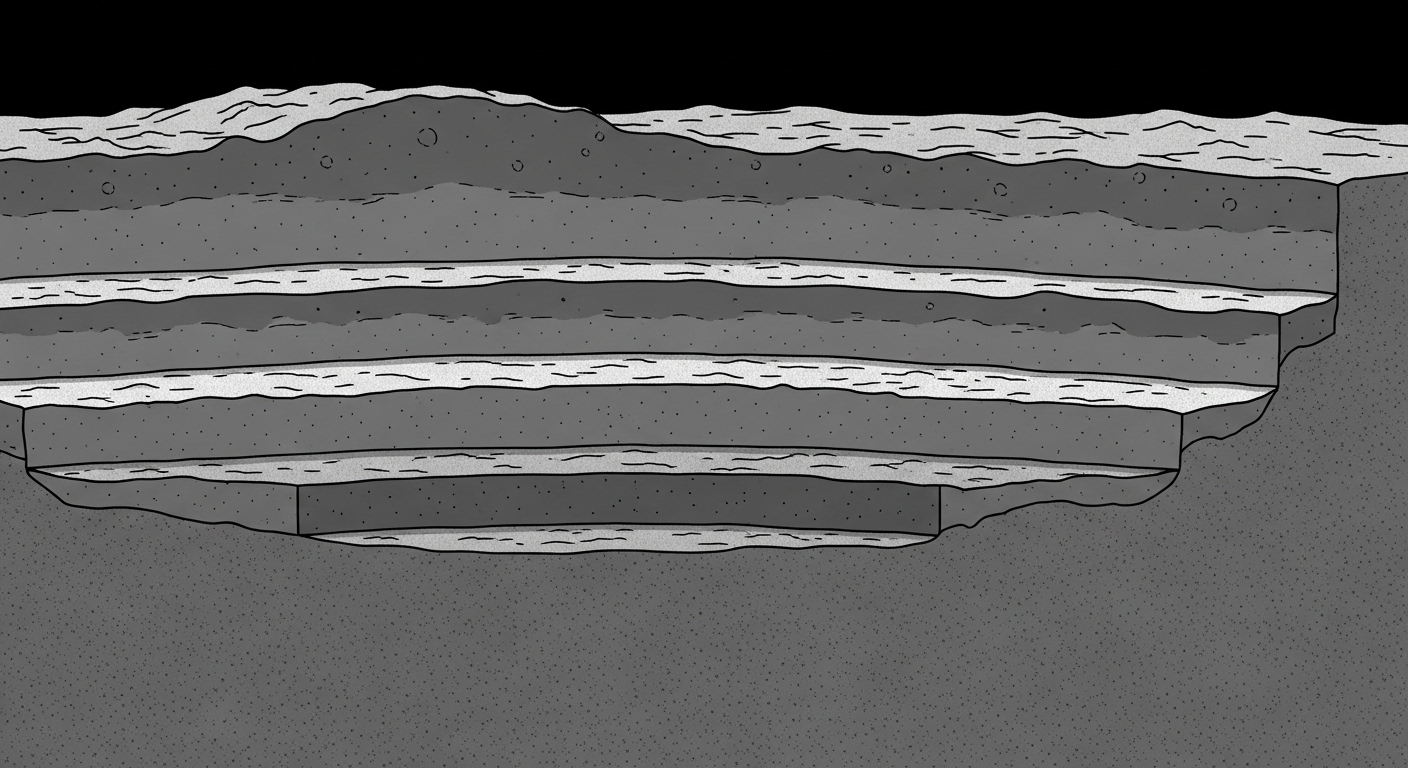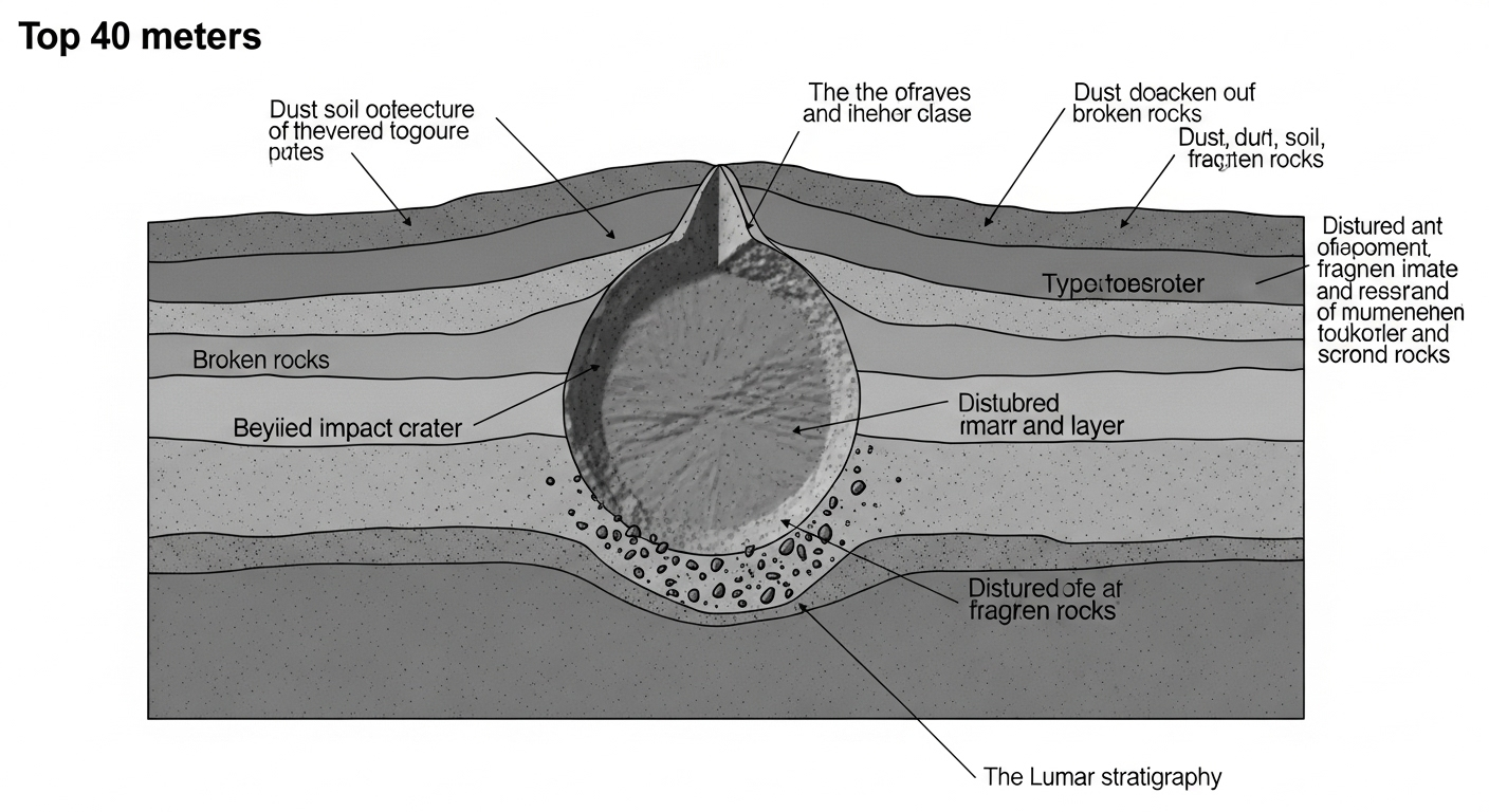 Alors, qu’est-ce que cette sonde a trouvé ? Imaginez que l’on puisse couper une tranche du sol lunaire. Les scientifiques, grâce aux données de Chang’e-4, ont pu voir ce qu’il y a sous nos pieds si on marchait là-bas. Les premiers 40 mètres de profondeur ne sont pas un bloc solide. C’est en fait un empilement de plusieurs couches : de la poussière très fine, de la terre et des cailloux de toutes tailles. C’est le résultat de milliards d’années de bombardement par des météorites. Et, surprise, bien cachée dans ces couches, l’analyse a révélé la présence d’un ancien cratère, formé par un impact très violent, qui a été ensuite recouvert avec le temps.