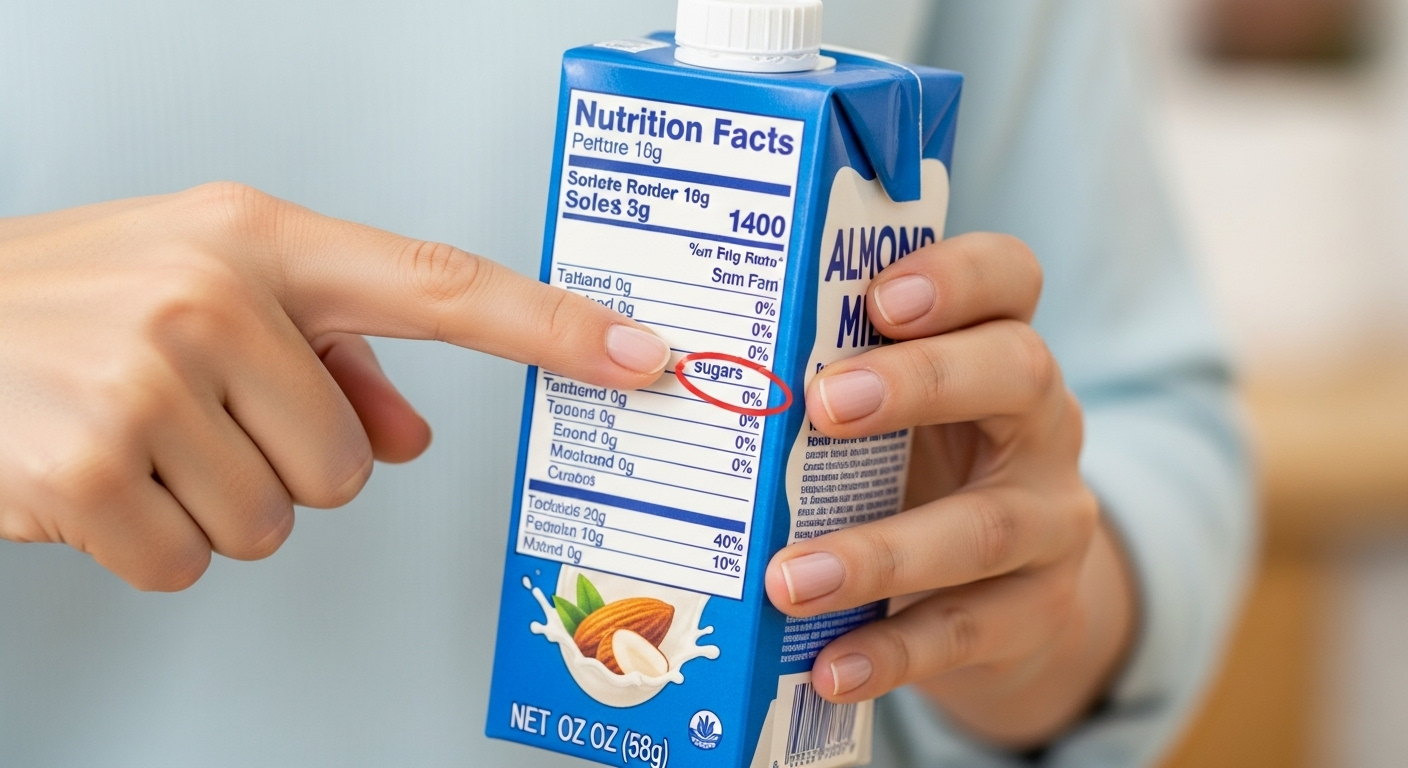 Que vous choisissiez du lait d’amande ou de coco, il y a une règle d’or : il doit être « sans sucre ajouté ». C’est écrit noir sur blanc sur la brique, et c’est le point le plus important.