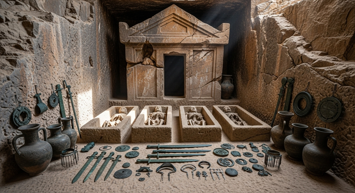 Imaginez une petite maison taillée directement dans la roche. C’est la forme de ce tombeau datant du septième siècle avant Jésus-Christ. À l’intérieur, les restes de quatre personnes reposaient sur des lits de pierre. Autour d’eux, un véritable trésor attendait : des poteries, des armes, des ornements en bronze et même des accessoires pour cheveux en argent. C’est une photographie incroyable d’un rituel funéraire d’il y a plus de deux millénaires.