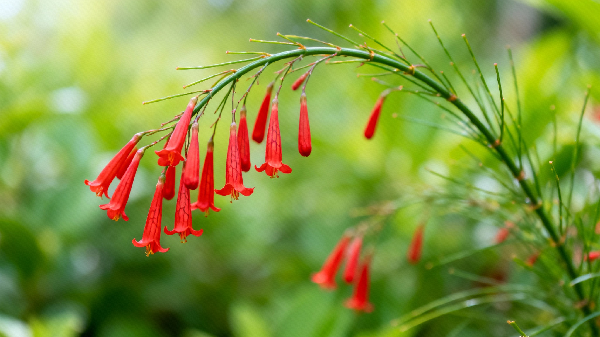 Originaire du Mexique, la Fleur-corail (Russelia equisetiformis) a parfaitement su s’acclimater aux régions tropicales et subtropicales. Elle est remarquable par ses tiges fines et retombantes, couvertes d’une multitude de petites fleurs tubulaires, le plus souvent rouges ou orangées, qui donnent l’impression d’une cascade écarlate.