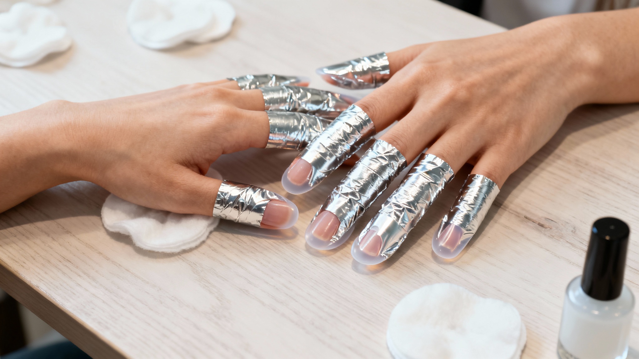 Ensuite, on imbibe des morceaux de coton d’un dissolvant à l’acétone, on les applique sur l’ongle, puis on enveloppe le tout dans des papillotes d’aluminium (ou des embouts en silicone). Après dix à vingt minutes d’attente, le vernis se décolle. On utilise alors un outil spécial, souvent appelé quick remover, pour pousser doucement la matière vers l’extérieur, sans jamais gratter l’ongle lui-même, ce qui pourrait gravement l’abîmer.
