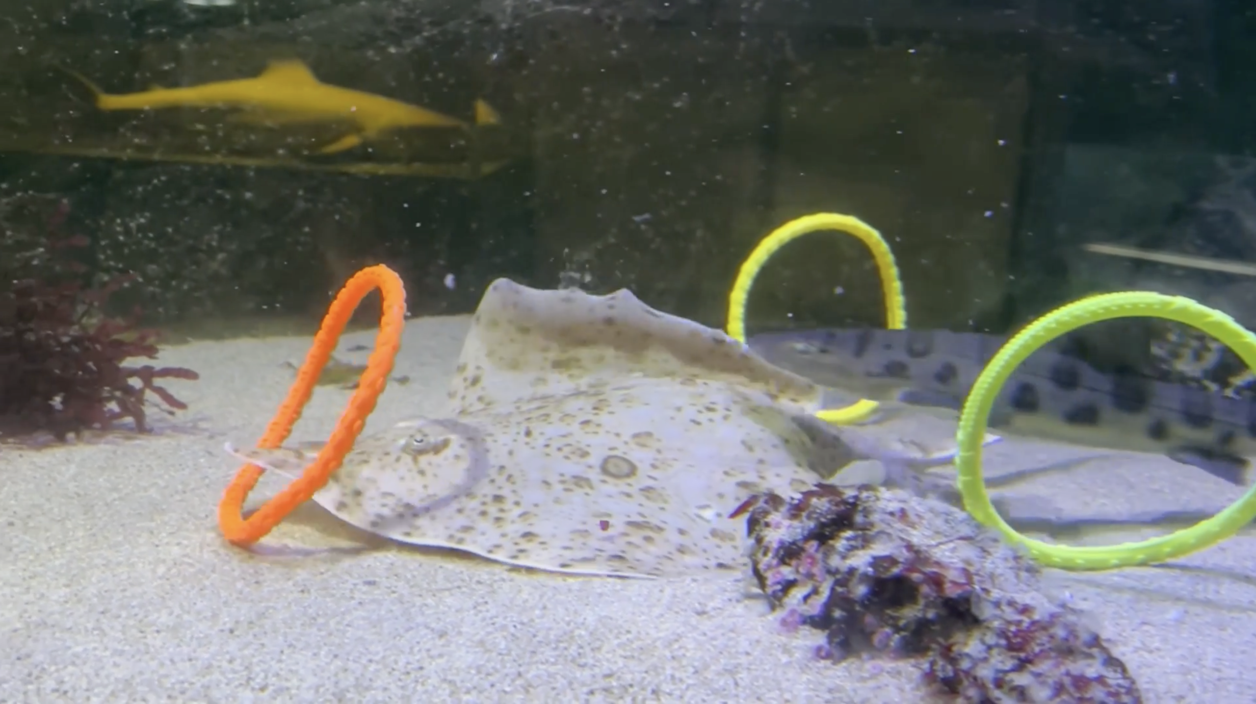 Ce qui s’est passé ensuite est assez incroyable. Au début, les animaux étaient méfiants, ce qui est normal, mais la curiosité a vite pris le dessus. Imaginez la scène : un jeune requin léopard fonçant sur un calmar en plastique avant de faire un écart au dernier moment pour éviter les tentacules en caoutchouc. Juste à côté, une raie de Californie a saisi un anneau orange pour le faire rouler au sol avec sa bouche. Un requin dormeur cornu (horn shark) s’est même appliqué à passer lentement à travers un cerceau jaune, nageoires comprises.