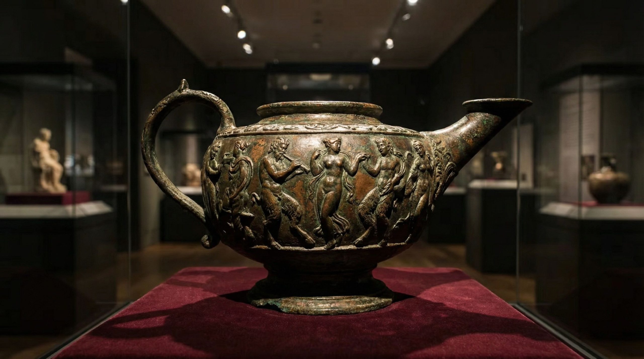 Il est fascinant de voir comment chaque pièce trouvée complète un peu plus le puzzle de cette civilisation. D’ailleurs, pour l’anecdote, un autre objet étrusque impressionnant présentant des traits hellénisés mérite d’être mentionné : une lampe en bronze massive dont le symbolisme est resté un mystère pendant des décennies. Ses images de nymphes des forêts et de satyres ont finalement été identifiées comme étant des fêtards de Dionysos, la divinité grecque du vin, de la fertilité, de l’extase, du mysticisme et du théâtre. Il apparaît d’ailleurs sous la forme d’un dieu cornu dans les figures ornementales qui les entourent.