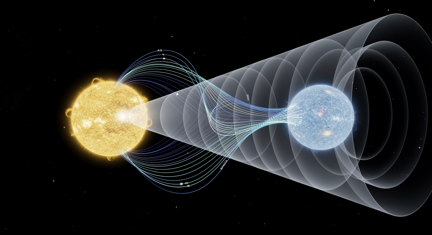 Les données radio nous offrent bien plus qu’une simple confirmation. Le rythme particulier de ces impulsions agit comme un véritable battement de cœur qui nous révèle la nature du système. Inspirés par une étude précédente, nous avons modélisé GPM J1839-10 : imaginez une naine blanche générant un faisceau radio lorsque son pôle magnétique balaie le vent stellaire de sa compagne. L’alignement changeant des deux corps par rapport à notre ligne de visée prédit exactement ce motif de battement cardiaque.