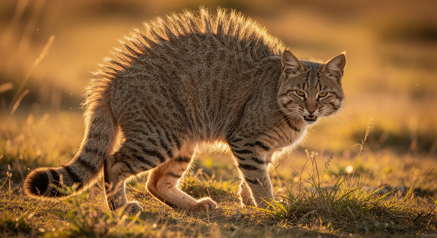 Le chat des pampas manifeste un phénomène physiologique appelé piloérection, qui se déclenche lors des confrontations. Concrètement, la fourrure située le long de son dos et de sa queue se hérisse de manière spectaculaire pour impressionner l’adversaire. Si l’on peut observer une version atténuée de ce comportement lorsque votre animal de compagnie s’énerve contre le facteur, chez le chat des pampas sauvage, il s’agit d’une démonstration d’agressivité bien plus intense.