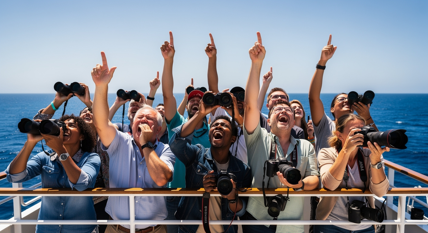 La scène s’est déroulée lors d’une excursion en mer dédiée à l’observation de la faune aviaire, réunissant une vingtaine de personnes à bord. L’apparition soudaine de l’animal a provoqué une onde de choc parmi les passagers. L’atmosphère sur le bateau s’est instantanément transformée face à la rareté de l’instant.