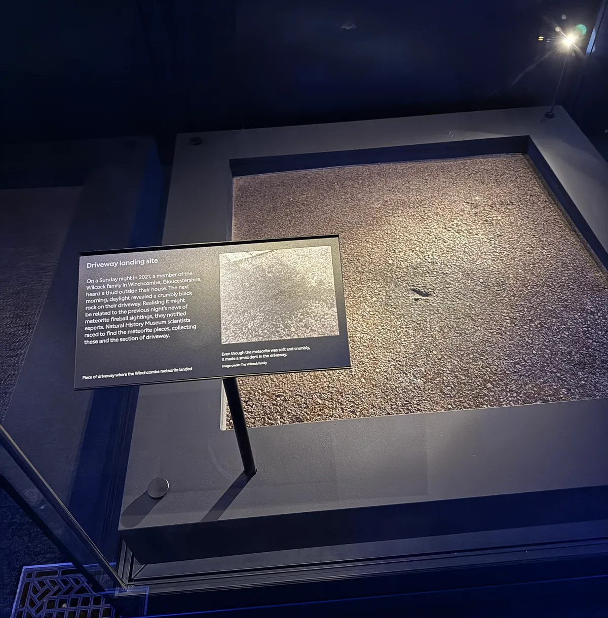 Ce morceau d’allée est désormais exposé au Musée d’Histoire Naturelle de Londres. Il côtoie le plus gros morceau de la météorite, qui a été découvert dans un champ par Mira Ihasz, une bénévole faisant partie d’une équipe de recherche de l’Université de Glasgow. D’autres fragments de la météorite ont également rejoint les collections du Musée de Winchcombe.