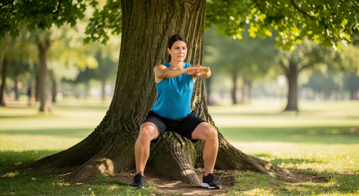 Une fois le corps réchauffé, le travail de renforcement musculaire débute avec la partie inférieure du corps. L’exercice du squat s’adapte à la perfection à l’environnement arboré. La position initiale demande de se tenir debout, le dos légèrement appuyé contre le tronc d’un arbre. Les pieds doivent être écartés pour s’aligner exactement à la largeur des épaules.