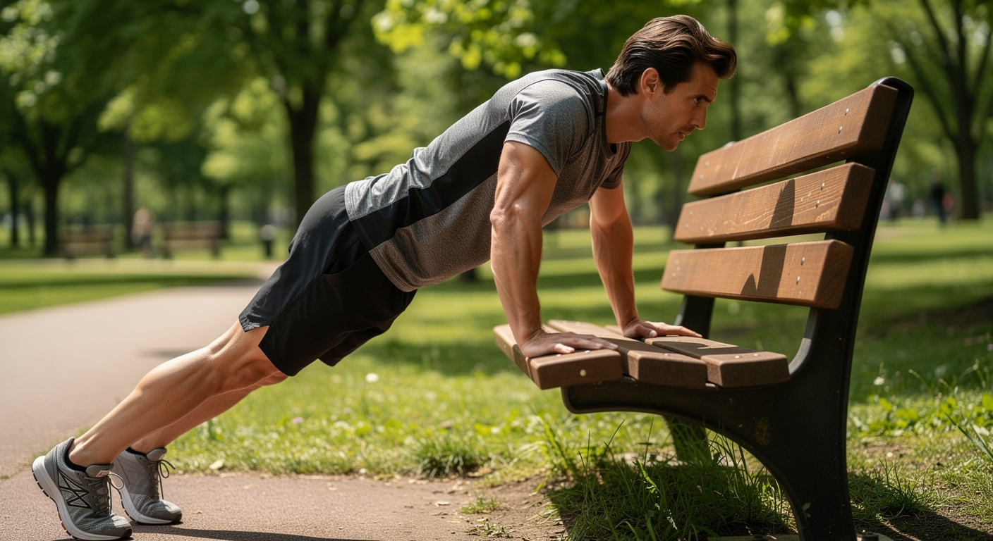 Le haut du corps requiert une attention équivalente durant cette séance en extérieur. Le mobilier urbain, tel qu’un banc, se transforme alors en équipement d’entraînement. Pour se mettre en place, le pratiquant pose ses mains sur le dossier d’un banc. Le corps doit rester bien droit avant d’entamer une série de pompes inclinées.