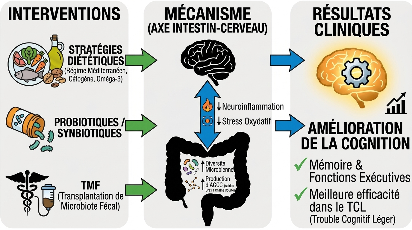Les résultats démontrent que la stimulation de l’intestin par les probiotiques, et tout particulièrement par la transplantation de microbiote fécal, s’est traduite par une meilleure fonction cognitive. La TMF s’est distinguée en entraînant les changements les plus rapides et les plus spectaculaires sur la santé intestinale. De manière générale, le fait de moduler le microbiote via ces différentes voies contribue à améliorer la mémoire, la fonction exécutive et la performance cognitive globale, s’imposant comme une voie non médicamenteuse pour soutenir la santé du cerveau.