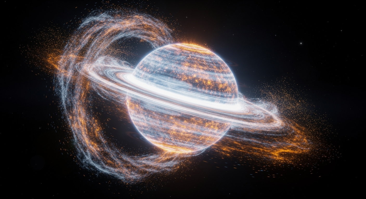 L’étude approfondie du signal émis par Gandalf a mis en évidence une signature en crête. Si elle ressemblait de prime abord à celle d’une naine blanche entourée d’un disque de matière, le signal alternait ici entre deux pics au cours du cycle de rotation de six minutes de l’étoile. « Nous n’avons jamais rien vu de tel auparavant chez une naine blanche, » a souligné Andrei Cristea. Ce motif correspond exactement à ce que produirait un demi-anneau de gaz ionisé en orbite, piégé dans la magnétosphère de l’étoile : le premier pic apparaît lorsque le demi-anneau pointe vers la Terre, le second correspond à l’espace vide de l’anneau. Comment ce demi-anneau a pu se former et se maintenir reste un mystère de la physique stellaire. On estime que Gandalf, situé à environ 1 100 années-lumière, a atteint sa forme actuelle suite à une collision survenue il y a 60 à 70 millions d’années.