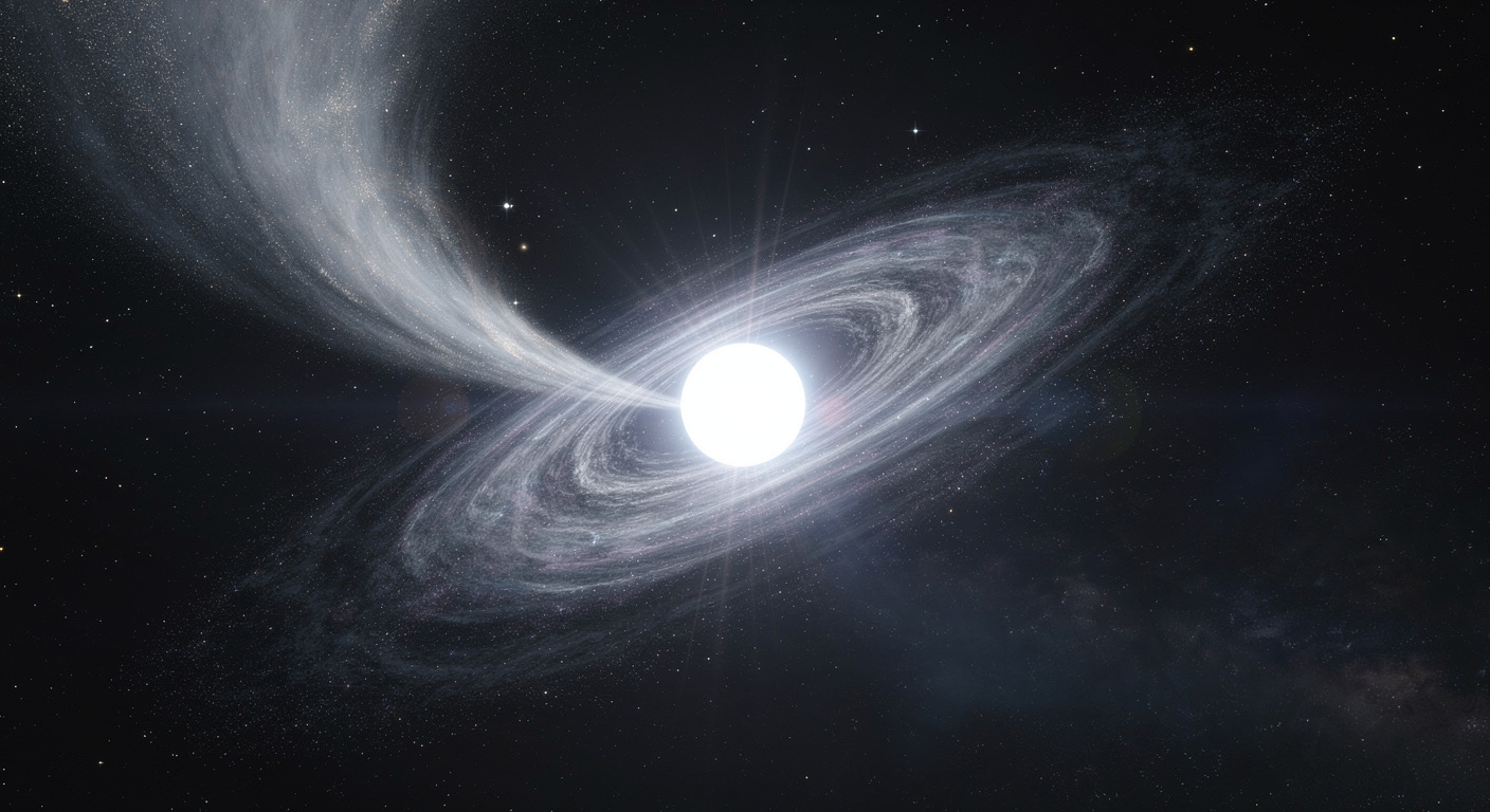 Dans ce cadre, la matière aurait une source totalement indépendante de la naine blanche issue de la fusion. L’astre, par sa force gravitationnelle et son champ magnétique, capturerait lentement cette matière errante croisant son sillage.