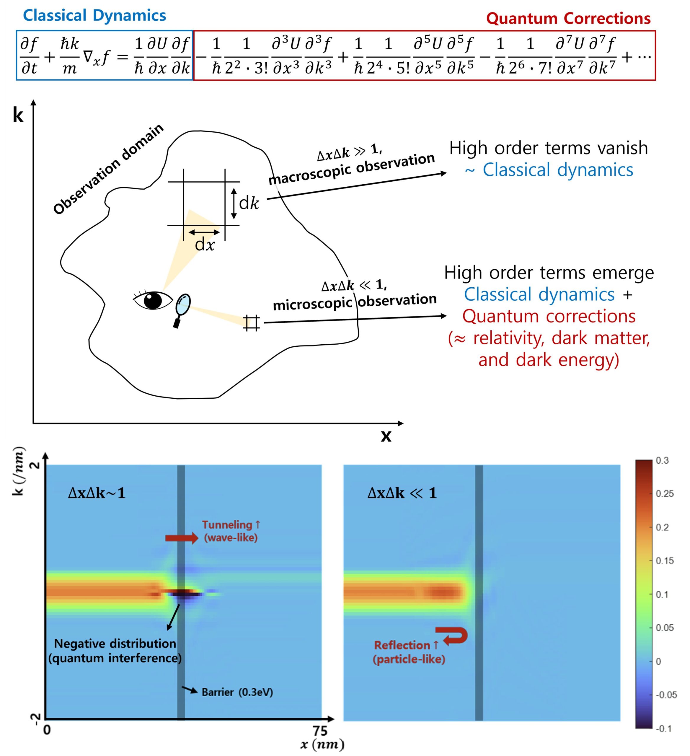 Ce mécanisme est particulièrement visible dans un exemple simple de franchissement d’une barrière unique par effet tunnel. L’interférence quantique émerge logiquement lorsque la résolution est autour de ΔxΔk ∼ 1. Cependant, cette même interférence disparaît purement et simplement dans la limite de haute résolution (ΔxΔk ≪ 1), moment où le système évolue irrémédiablement vers une distribution classique positive.