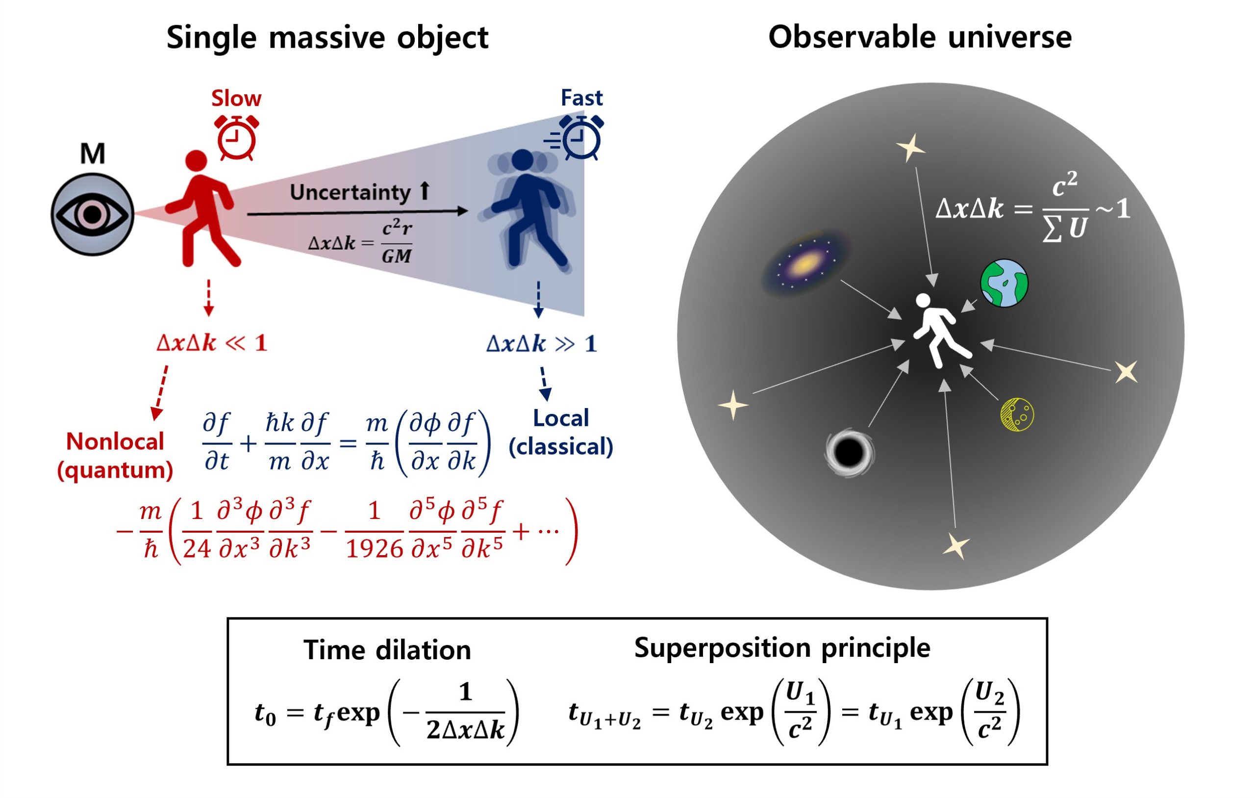 En s’appuyant sur ces mécanismes de l’espace des phases, l’auteur propose d’interpréter les corrections quantiques dépendantes de la résolution comme des effets relativistes induits par la gravitation. L’idée centrale est que si la résolution de l’espace des phases augmente avec le potentiel gravitationnel, les corrections quantiques deviennent alors dépendantes de la position géographique dans l’univers.