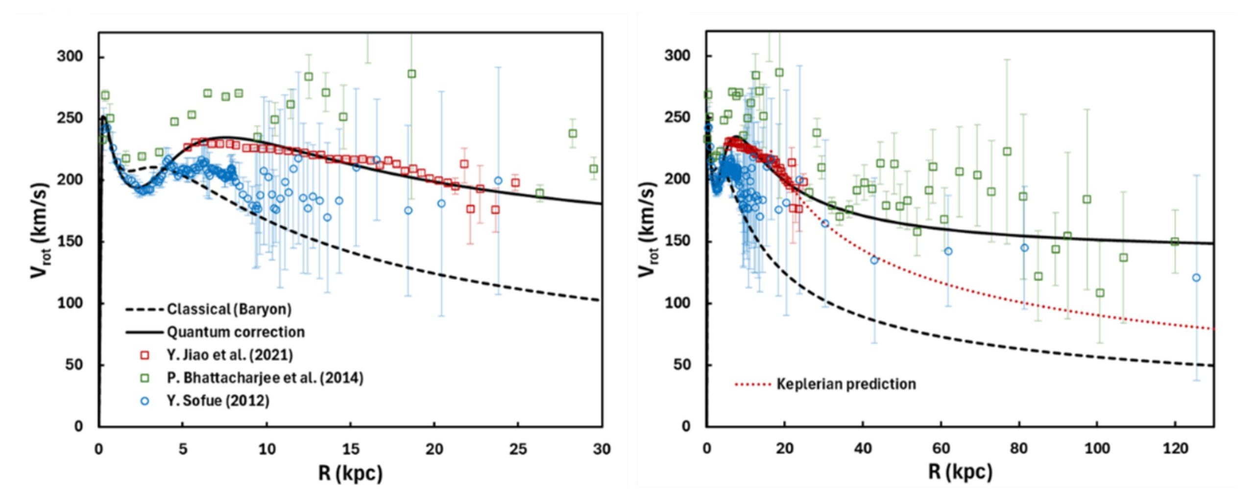 En modélisant les galaxies comme des paquets d’ondes de densité, ces corrections peuvent être réduites à un potentiel gravitationnel additionnel au sein de la dynamique newtonienne, ce qui permet de reproduire les courbes de rotation plates observées par les astronomes. Dans cette interprétation, la notion de matière noire ne correspond pas à une masse cachée, mais bien à des forces corrigées quantiquement, gouvernées par la courbure du potentiel baryonique et la nature ondulatoire des distributions de masse. Le cadre suggère ainsi que les courbes de rotation peuvent varier de manière significative en fonction de la morphologie d’une galaxie et des effets d’interférence provenant de son environnement immédiat.