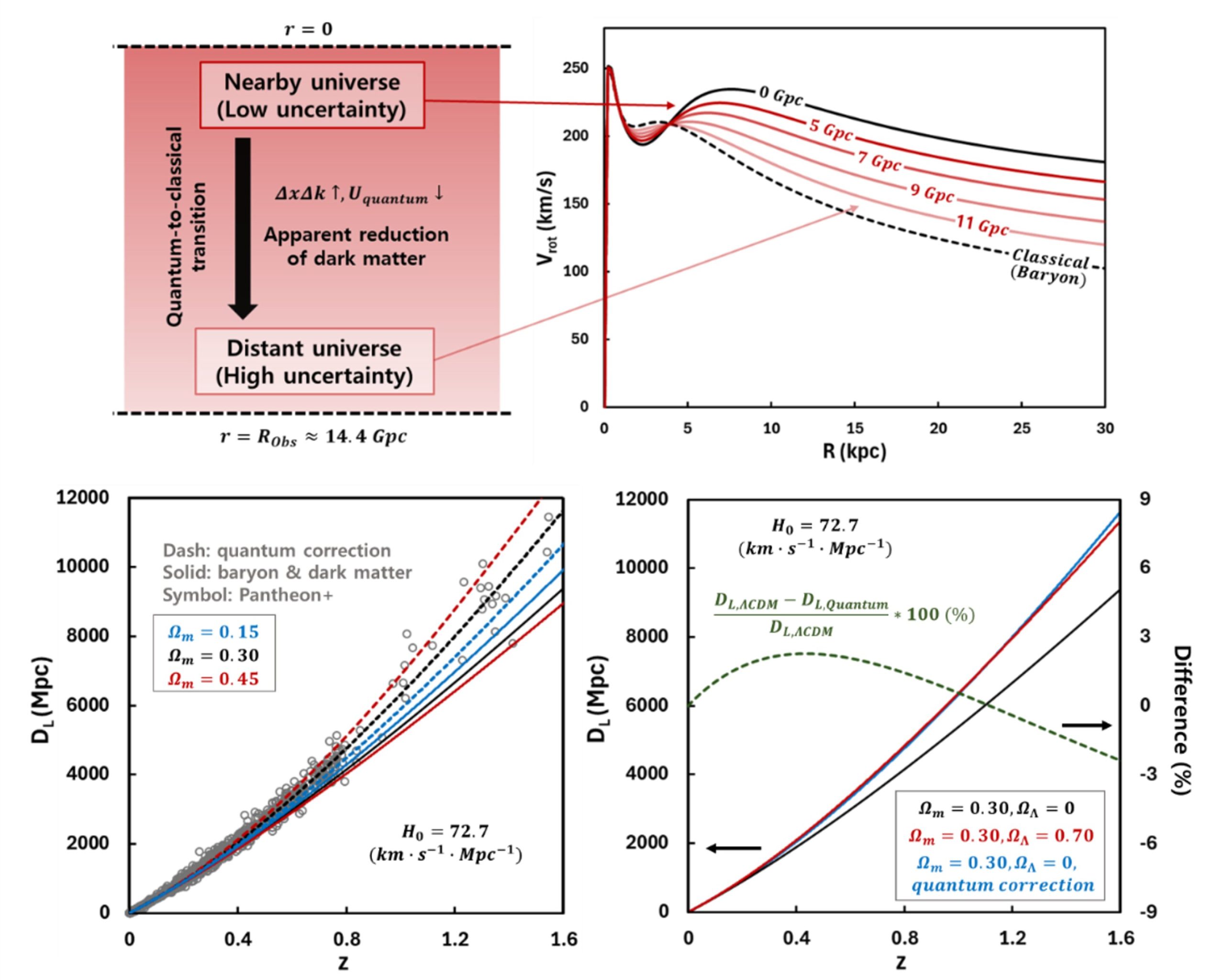 Parallèlement, la réduction des corrections quantiques à de très grandes distances modifie les relations entre le décalage vers le rouge et la distance cosmique. Cela produit une accélération apparente de l’expansion cosmique, sans qu’il soit nécessaire d’invoquer la présence d’une énergie sombre. Ce cadre théorique est capable d’expliquer les données des supernovas de type Ia (le jeu de données Pantheon+) et ressemble de très près au modèle ΛCDM. Il présente toutefois des déviations subtiles qui imitent les modèles d’énergie sombre évolutive. Pour permettre une comparaison quantitative précise avec la cosmologie standard, des recherches supplémentaires utilisant les données du fond diffus cosmologique (CMB) et des oscillations acoustiques des baryons (BAO) — qui sont pertinentes pour la physique de l’univers primordial et la structure à grande échelle — sont encore requises.