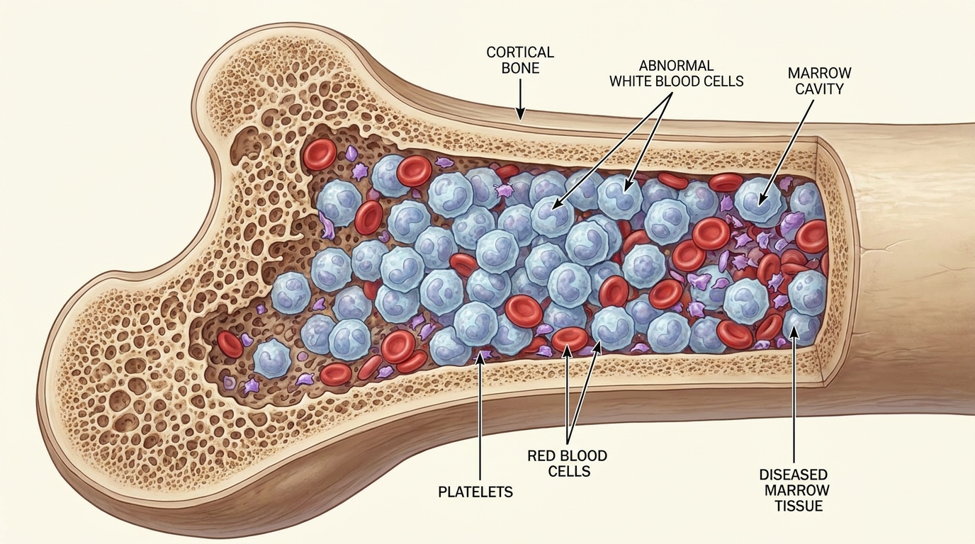 La leucémie est un cancer qui prend naissance dans les cellules de la moelle osseuse, l’usine de fabrication des cellules sanguines. Elle se caractérise par une production anarchique et excessive de globules blancs anormaux. Ces derniers envahissent la moelle osseuse et le sang, empêchant les cellules saines de fonctionner correctement et affaiblissant ainsi l’ensemble du système immunitaire.