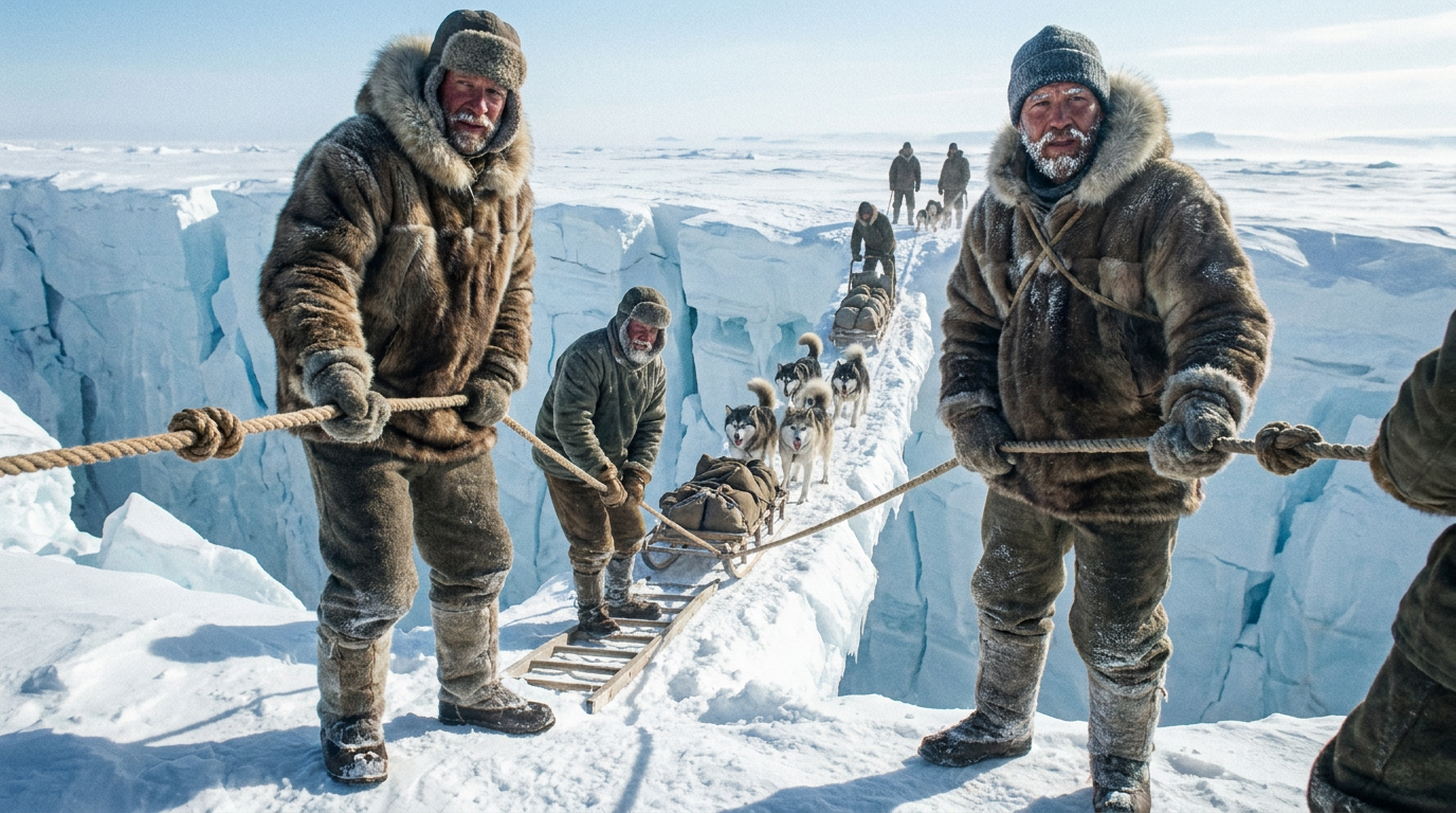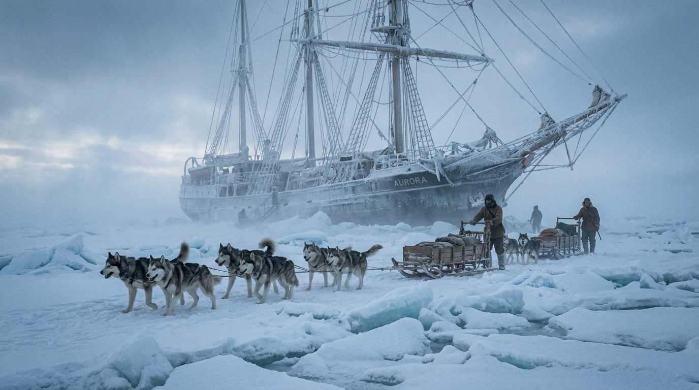 À l’arrivée initiale de l’expédition dans la baie des Baleines, le navire de ravitaillement « City of New York » n’a pu s’approcher à moins de douze miles de la Barrière. Le temps manquait cruellement pour établir le camp avant la fin des quelques semaines de l’été antarctique, forçant les équipes canines à travailler à un rythme fiévreux. L’intensité de la tâche exigeait par moments deux allers-retours par jour sur une glace très accidentée, cumulant une distance totale de quarante-huit miles. Les charges variaient de 2000 à 2500 livres, représentant plus de 200 livres de traction par chien, avec une moyenne de neuf huskies par attelage.